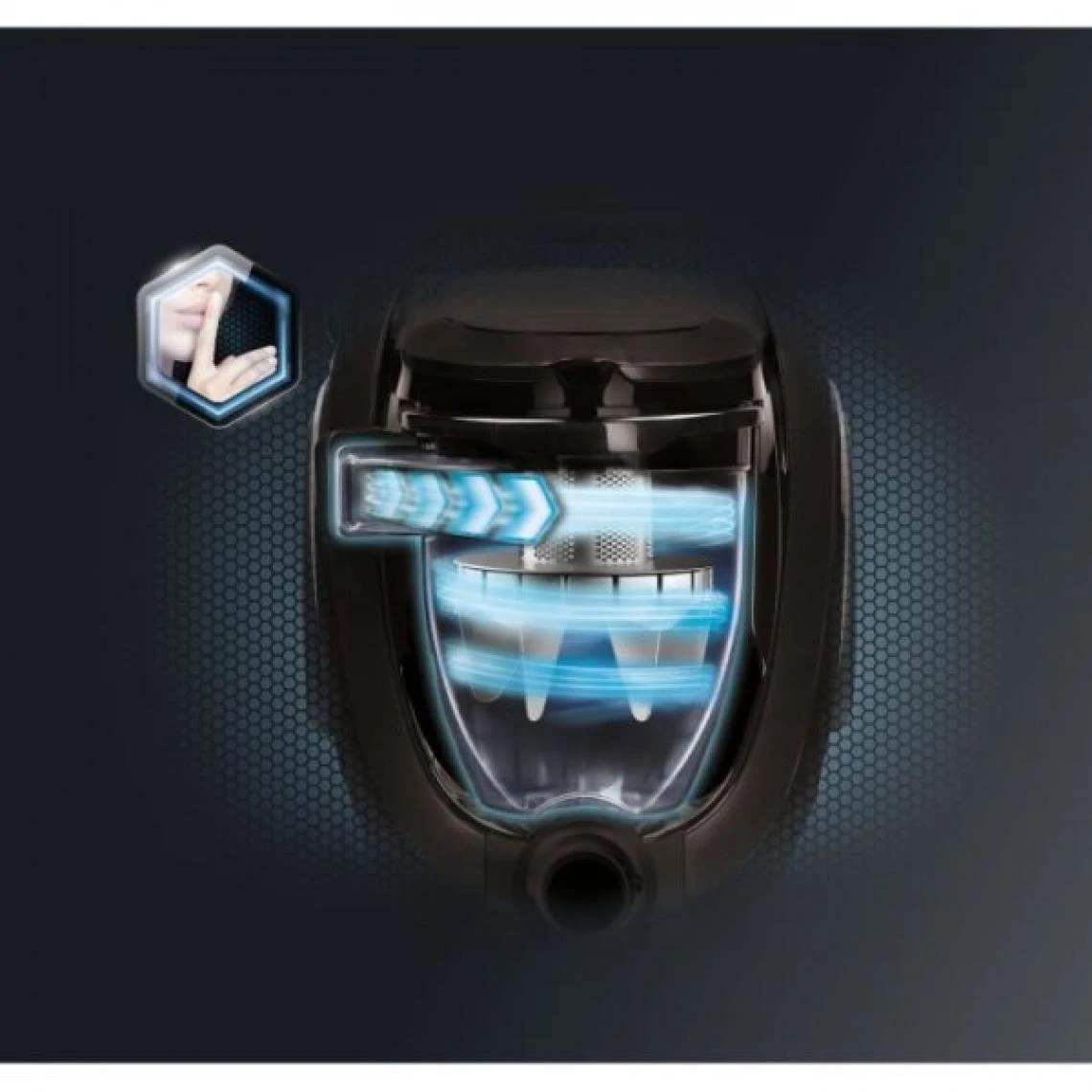 Le premier et le seul aspirateur sans sac cyclonique qui combine un tel niveau de performance et de silence (67 dBA). La nouvelle tete d’aspiration 2 positions, POWER AIR, garantit des résultats exceptionnels sur tous types de sols tout en apportant un confort d’utilisation optimal avec sa glisse extreme. Muni d’un bac a poussiere ultra pratique et facile a vider, il filtre 99,98 % de la poussiere aspirée.