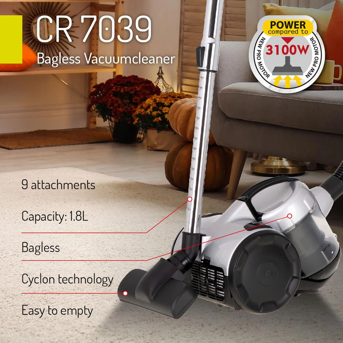 La technologie cyclonique sans sac de l’aspirateur Camry CR 7039 offre une grande puissance et une efficacité élevée, ainsi qu’un design extérieur attrayant et soigné. Il est compact, léger et facile à manipuler, conçu pour rendre votre vie plus confortable et faciliter les tâches ménagères. Son triple système de filtrage garantit un environnement exempt de bactéries et d’allergènes car il piège les plus petites particules et les empêche de retourner à l’extérieur. La capacité du réservoir est de 1,8 litre et il est facile et hygiénique de le vider.Il comprend une brosse universelle pour tous les types de sols et des accessoires pour nettoyer les tissus d’ameublement et autres surfaces et atteindre les coins les plus inaccessibles.La technologie cyclonique et une puissance de 700W, soit l’équivalent de 3100W, développent une grande puissance d’aspiration. CARACTÉRISTIQUES : Capacité du réservoir : 1,8 L. Technologie Cyclon. Pas de sac. Facile à vider. Filtre HEPA. Système de triple filtration. Brosse universelle pour tous les types de sols. 4 buses spéciales pour les tissus d’ameublement et les zones difficiles à atteindre. Puissance : 700W. Puissance comparable à 3100W. Voltage : 220-240V 50 / 60Hz.