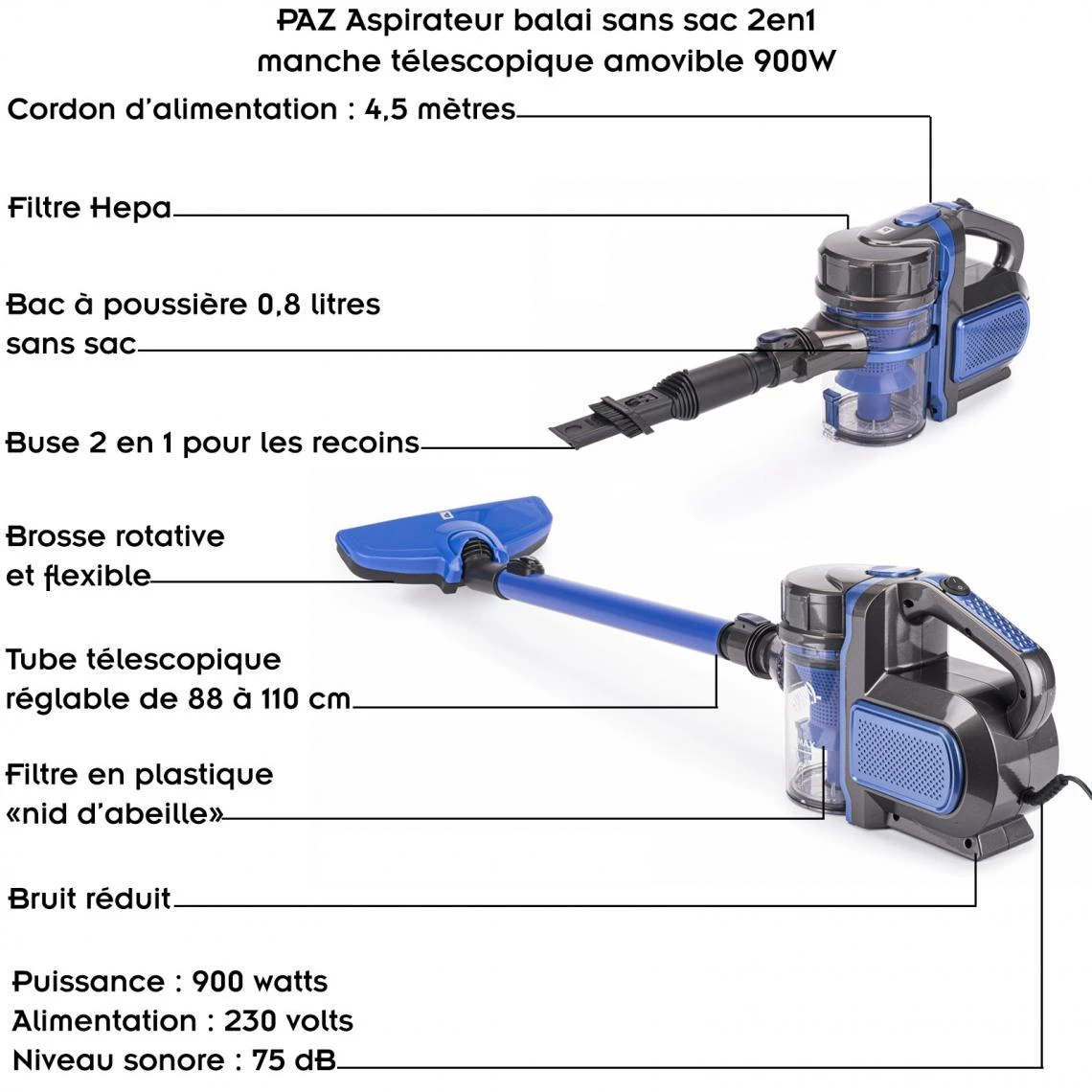 PAZ Aspirateur balai sans sac 2en1 manche télescopique amovible 900W