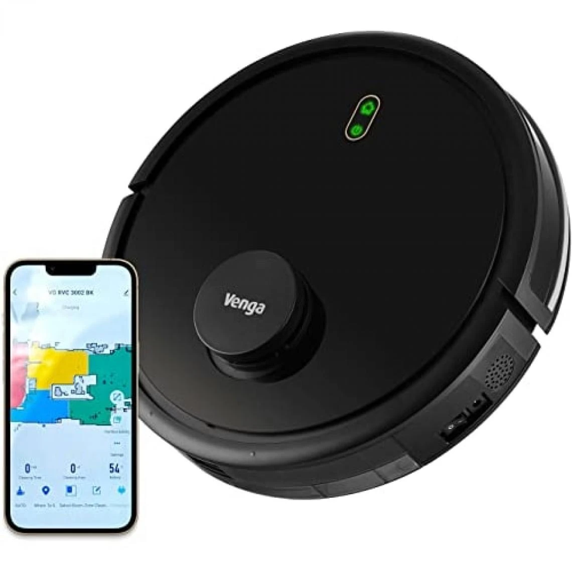 ROBOT ASPIRATEUR 3-EN-1 : Fonction Balai grâce à ses 2 brosses latérales et sa large brosse centrale. Fonction aspirateur avec une puissance d’aspiration jusqu’à 1800 Pa max. Fonction Laveur de sol avec un grand réservoir de 300 ml. Puissante batterie de 3200 mhA pour jusqu’à 120 min. d’autonomie et 60 min. en puissance d’aspiration max.NAVIGATION PAR LASER permettant de cartographier et mémoriser la maison pour un nettoyage encore plus efficace. Connexion Wi-Fi pour programmer et personnaliser le nettoyage depuis votre téléphone portable via App : création de zones de travail, de murs virtuels ou encore de zones interdites d’accès. Démarrage « Une Touche» pour commencer un cycle de nettoyage automatique complet. Equipé de capteurs anti-collisions et anti-chutes, retour automatique à la base de chargement pour un travail autonome. 6 MODES DE NETTOYAGE : Automatique, Nettoyage Localisé pour un endroit particulièrement sale, Nettoyage Périmètre pour faire le tour des murs, Nettoyage par Pièce pour faire tous les programmes dans un pièce dédiée, Nettoyage Laveur de Sol avec réglage du débit d’eau et Aspiration Maximum pour 2x plus de puissance. Avec fonction planificateur de nettoyage sur toute une semaine. Convient pour tous types de sols : parquets, carrelages, tapis avec capacité d’escalade de 1.5 cm.CONTIENT : 1 Robot Aspirateur Venga! VG RVC 3002 BK, 1 collecteur de poussières avec filtre HEPA, 1 réservoir d’eau, 4 brosses latérales, 1 brosse centrale, 2 lingettes de nettoyage, 1 outil de nettoyage, 1 télécommande.